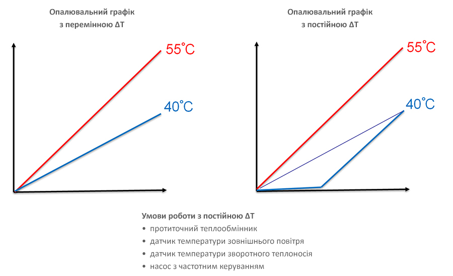 Робота по опалювальному графіку з постійною ΔТ призводить до більш низької температури теплоносія, до більш низької температурі відхідних, та як наслідок до меншого споживання газу котлом. Реалізована робота по опалювальному графіку з постійною ΔТ може бути тільки в протиточному теплообміннику.