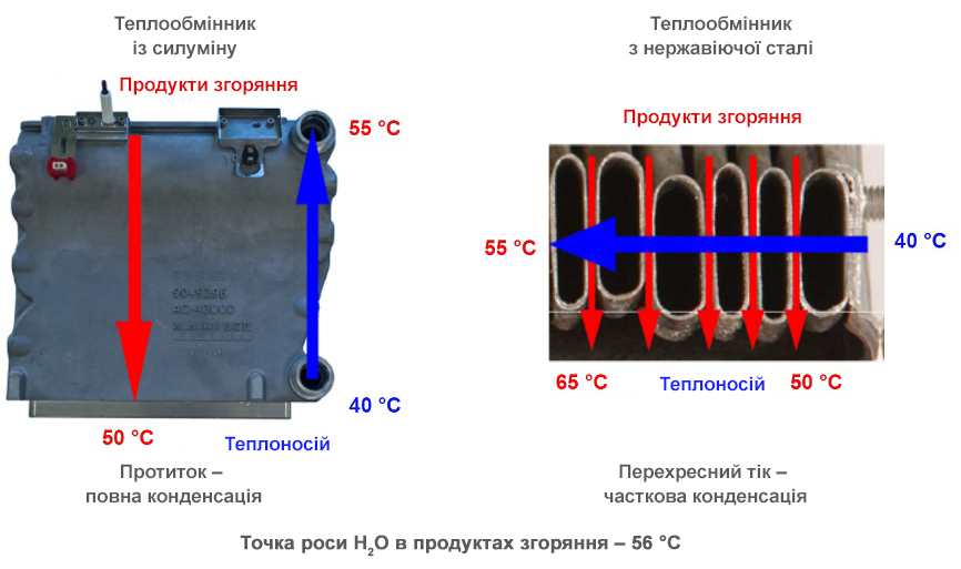 Як відомо найбільш ефективний теплообмін при протитечії: продукти згоряння та конденсат рухаються згори донизу, а вода, що нагрівається, рухається знизу до гори. При протитечії весь потік відхідних газів охолоджується холодним зворотнім теплоносієм та відбувається повна конденсація водяних парів з продуктів згоряння. Такий найбільш ефективний теплообмін реалізовано в силуміновому теплообміннику.