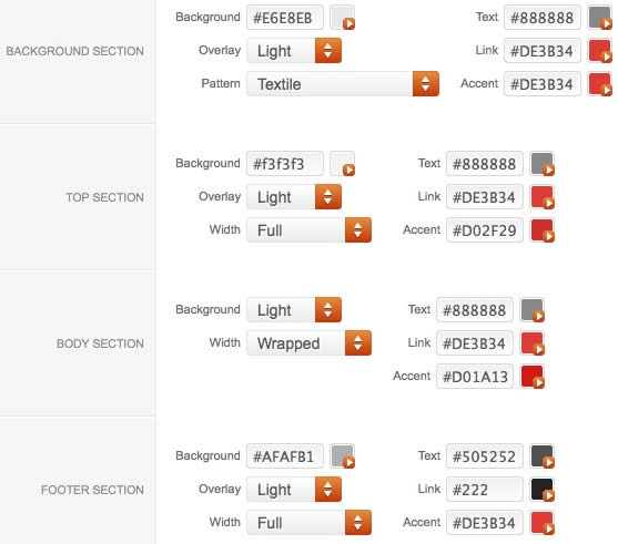 - Background: Background, Overlay (Light/Dark), Pattern, Text, Link & Accent